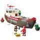 schwimmt im Wasser, ist aufrüstbar mit Unterwassermotor oder fährt auf Rollen. Mit großem Frachtraum und geheimer Luke für einen blinden Passagier. Dach abnehmbar zum Bespielen der Brücke. Mit ca. 100g Transportgut. Die Bojen sind schwimmfähig und blinken.